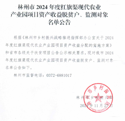 林州市2024年度红旗渠现代农业产业园资产收益脱贫户、监测对象名单公告