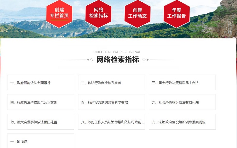 专栏共设网络检索指标、创建工作动态和年度工作报告三个栏目,主要内容涉及法治政府建设示范创建100项具体工作、法治政府建设信息报道和法治政府建设年度工作报告等,让人民群众更直观的了解、参与法治政府示范市创建工作。