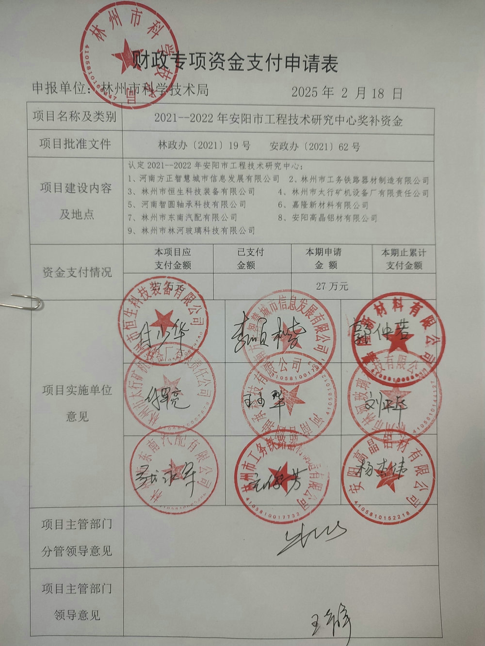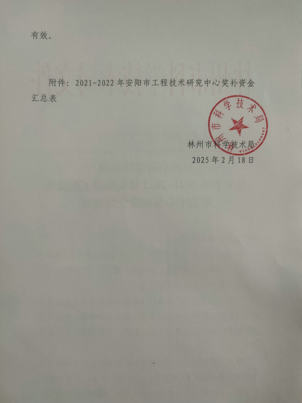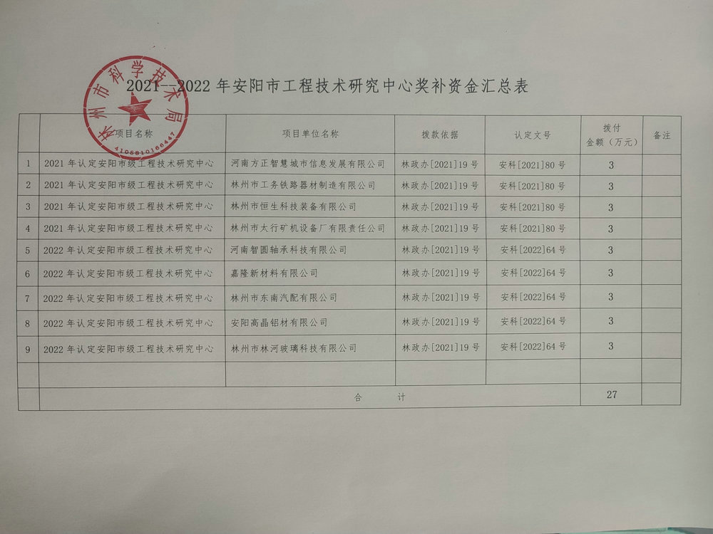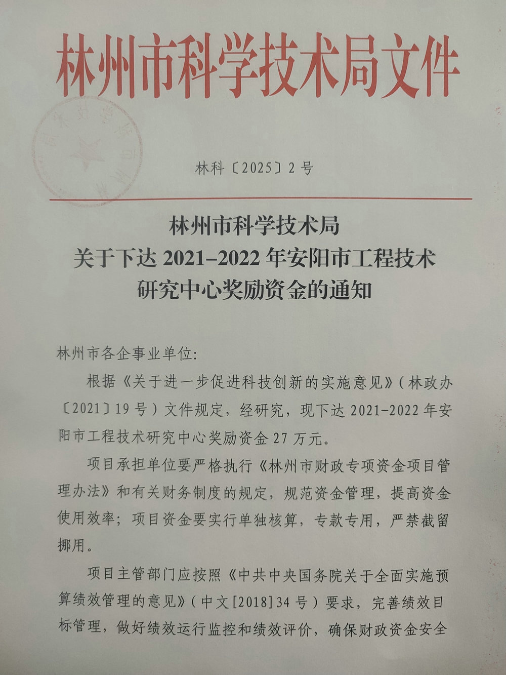关于下达2021-2022年安阳市工程技术研究中心奖励资金的通知